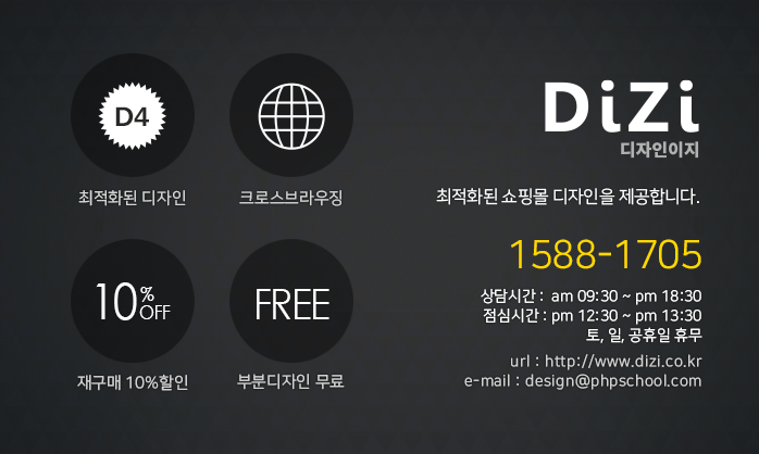디자인이지(dizi.kr)는 다년간의 쇼핑몰 성공 노하우와 빅데이터를 통해 최적화된 쇼핑몰 디자인을 제공합니다.