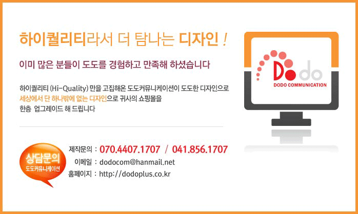 하이퀄리티만을 고집해온 도도커뮤니케이션이 세상에서 단 하나 밖에 없는 디자인으로 귀사의 쇼핑몰을 한층 업그레이드 해 드립니다